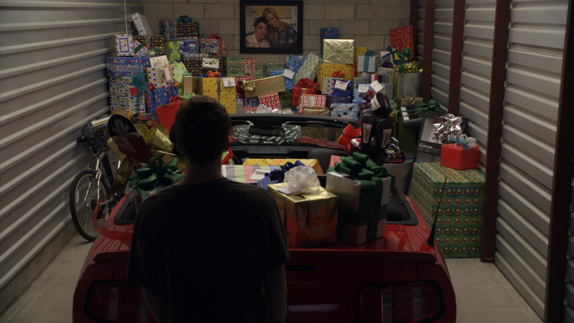 當 Adam 騎腳踏車來到倉庫前,我們心裡浮現的畫面是:「哦,他要發現那輛車了。」但當鐵門被拉起時,映入眼簾的不只是那輛跑車,還有堆滿整個牆面的禮物,正因為毫無防備,情感的衝擊力被放大了數倍。看到那滿坑滿谷的禮物時,我真的好震驚好震驚。