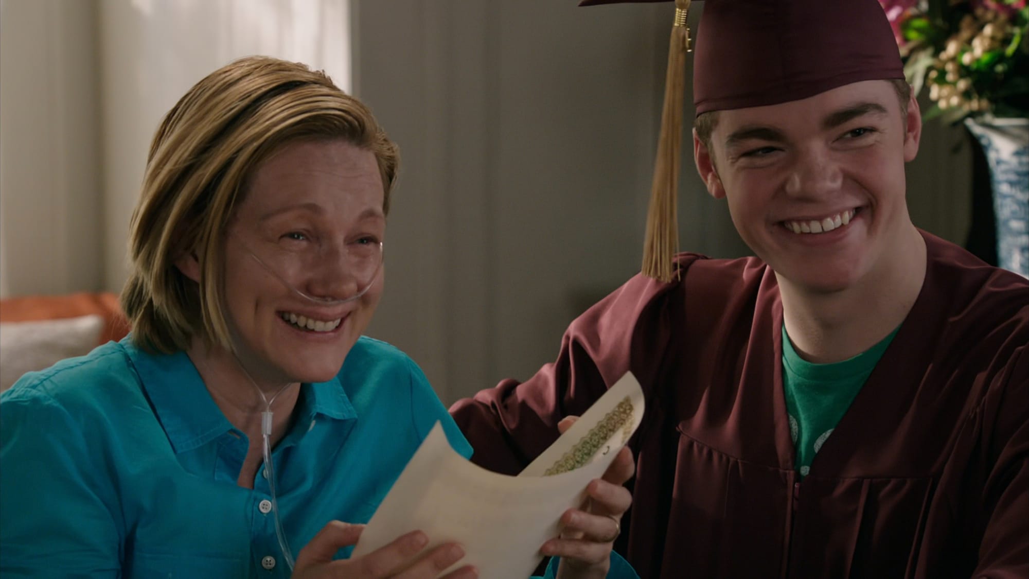 而對我來說最具震撼力的時刻,肯定是當 Cathy 的兒子 Adam(Gabriel Basso 飾)發現她留給他的禮物。這場戲完全沒有對白,將 show, don't tell 運用到極致。Cathy 可以坐下來對 Adam 說:「我很愛你,但我不會看到你長大了。」但言語的力量,遠不及鐵門拉起後那滿坑滿谷禮物帶來的視覺衝擊。